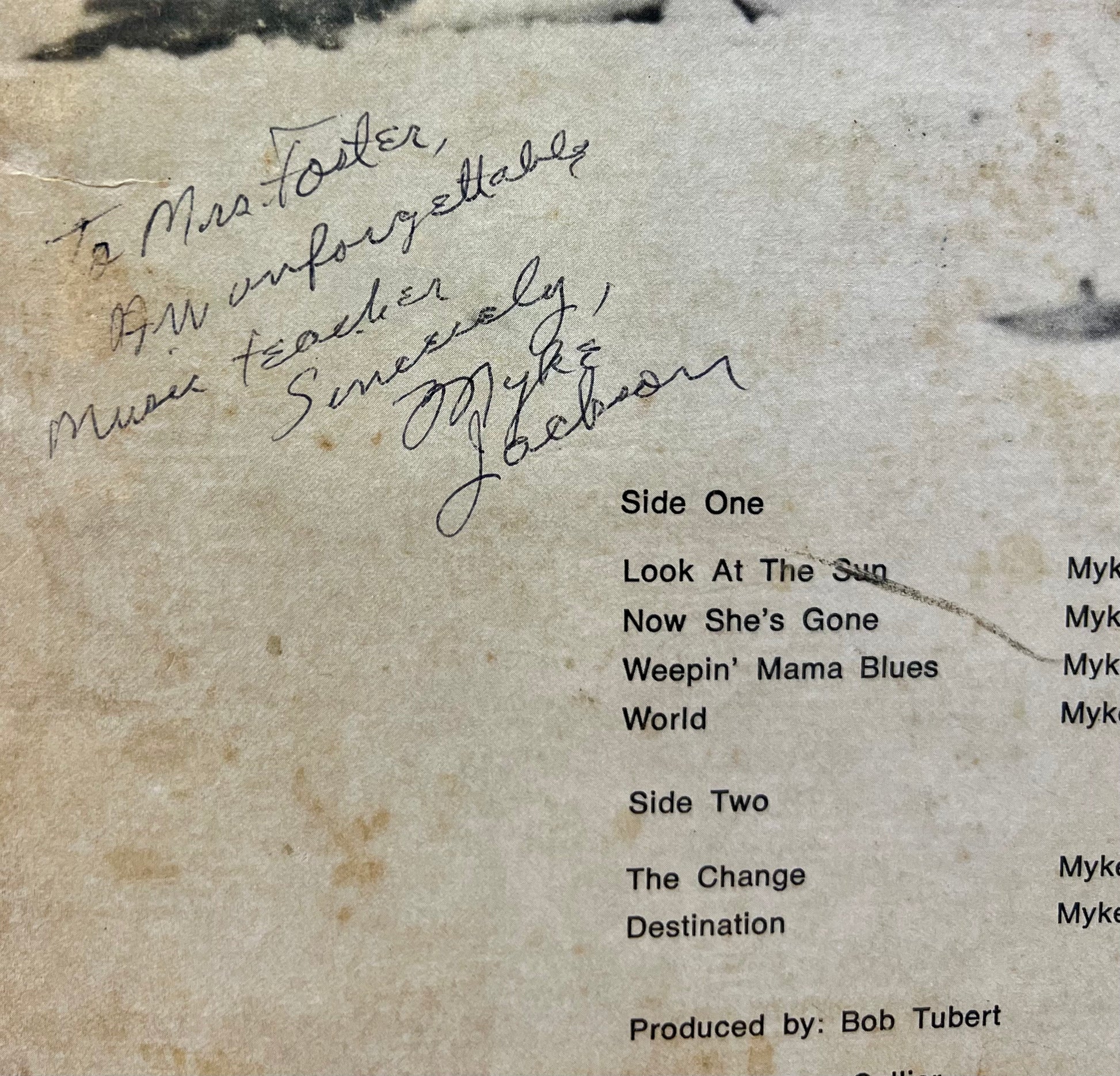 Autographed by a 17-year-old Myke Jackson - a gift to his teacher: "To Mrs. Foster, My unforgettable Music teacher Sincerely, Myke Jackson".