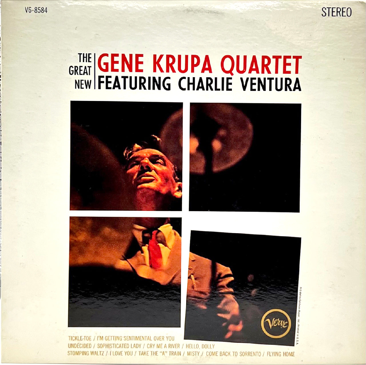 Used vinyl is Very Good almost Very Good Plus but has minor buffs / Artwork is Very Good plus plus with only minor ringwear at the top on the front and back / First pressing by Verve Records 1964 / Drummer Gene Krupa's final recording as a leader reunited him with the bombastic tenor saxophonist Charlie Ventura in a quartet with pianist John Bunch and bassist Nabil Totah. The group mostly performs brief versions of standards including "Come Back to Sorrento," "Take the 'A' Train," "Flying Home," and even "Hello Dolly." Ventura's extroverted playing (on tenor, alto and baritone) is not for everyone's taste but he is in generally good form, and even an aging Krupa still retains his youthful excitement and enthusiasm.