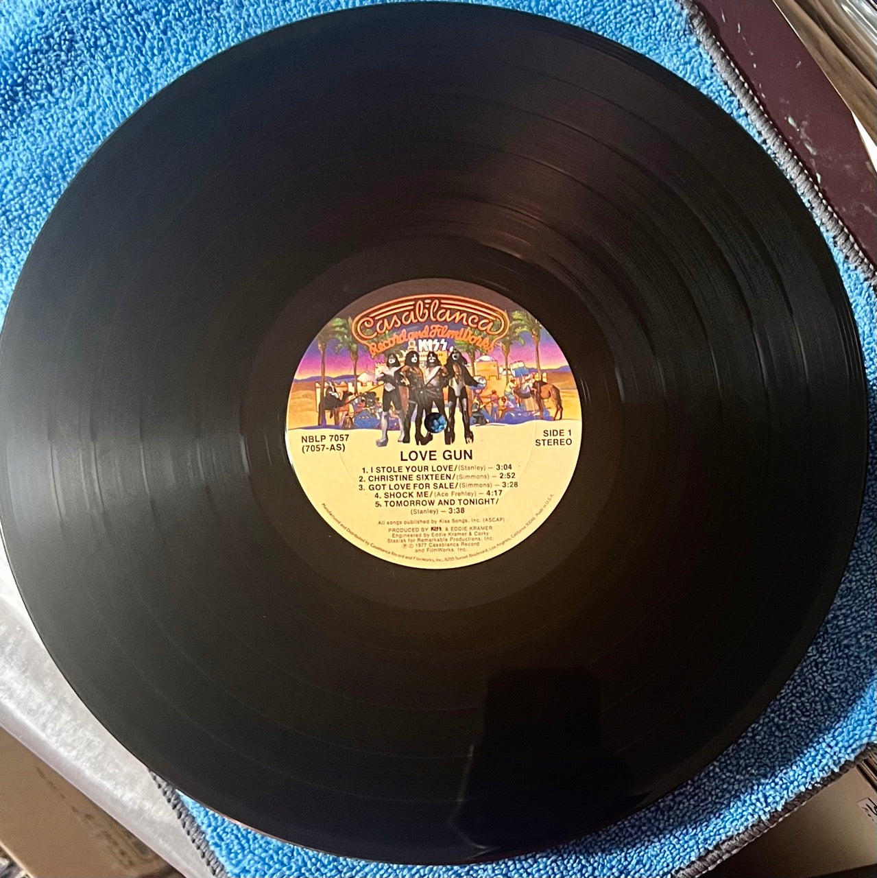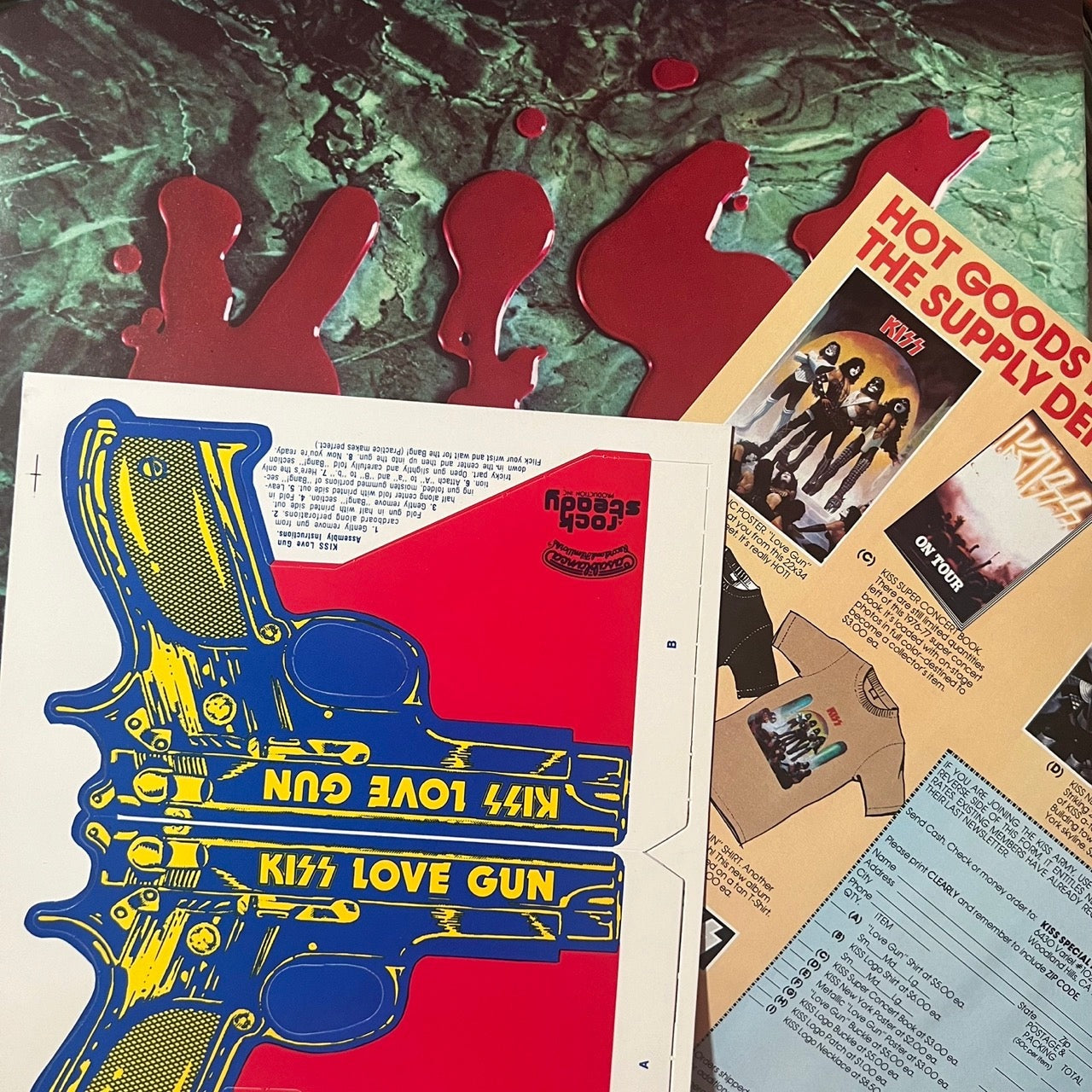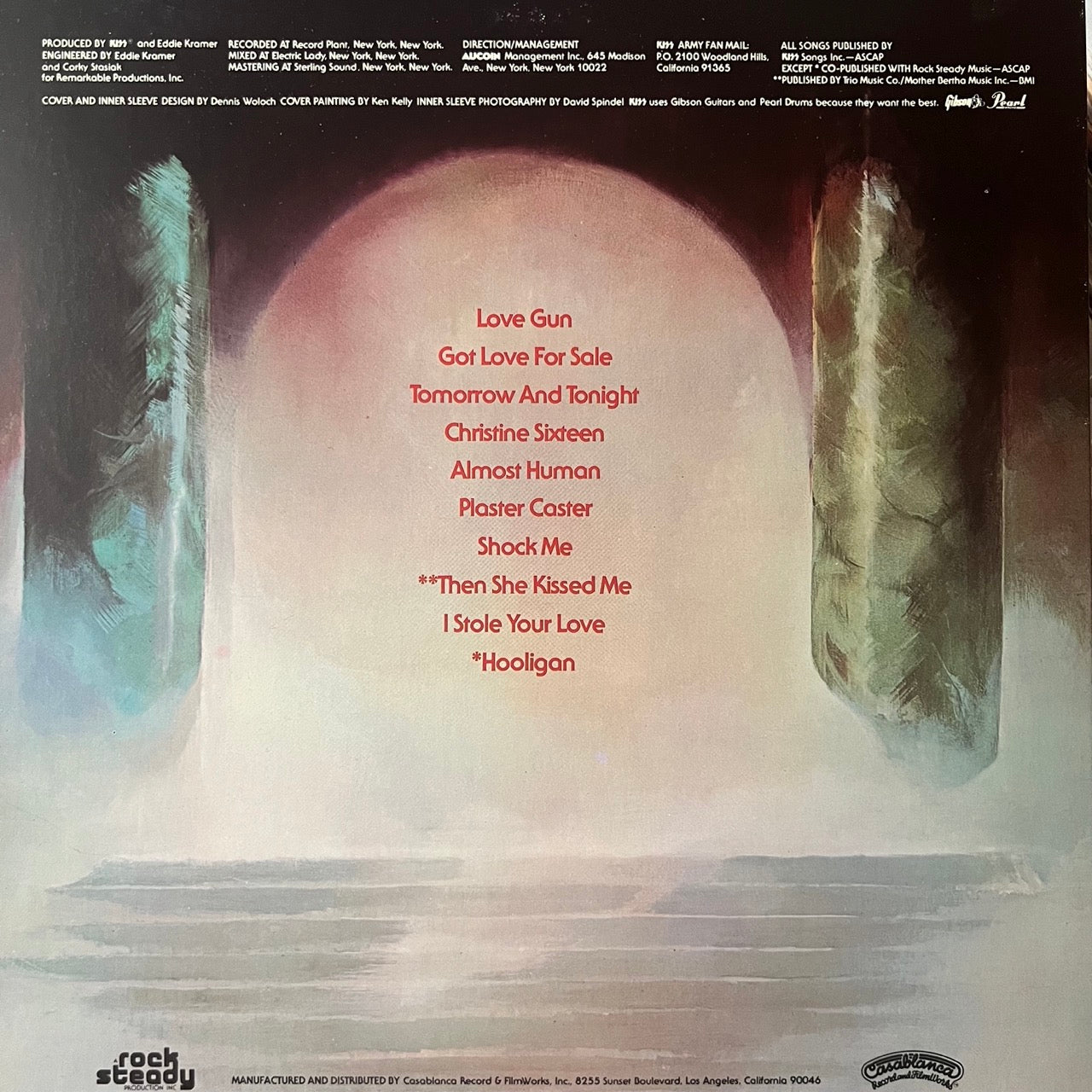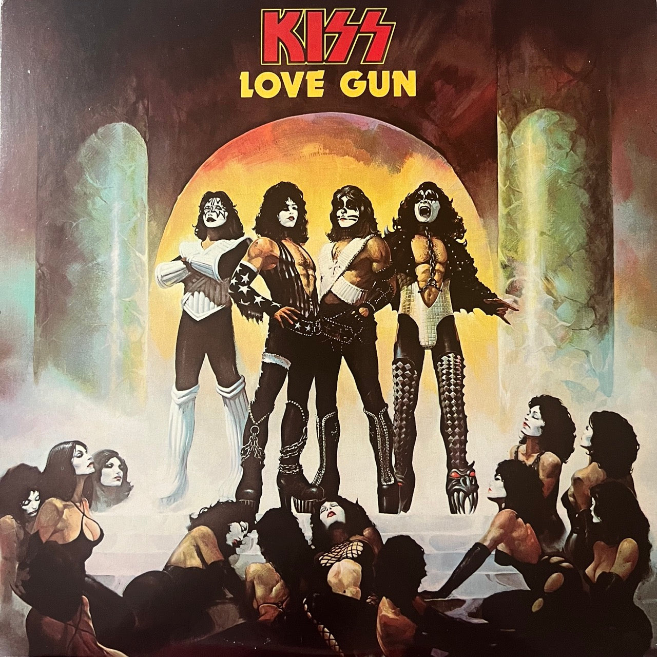 USED vinyl Near mint! Includes all of the inserts, INCLUDES 'POP GUN' unfolded and 'unpunched' and not assembled, promotional catalog advertisment for KISS fanclub, full-color insert sleeve. Artwork and Vinyl are Near Mint! / *I couldn't find a copy this clean and intact on Discogs. The closest I found was a copy for $200+ and the Love Gun was assembled. / Love Gun was Kiss' fifth studio album in three years (and seventh release overall, peaking at number four on Billboard), and proved to be the last release that the original lineup played on. By 1977, Kiss merchandise was flooding the marketplace (lunch boxes, makeup kits, comic books, etc.), and it would ultimately lead to a Kiss backlash in the '80s. But the band was still focused on their music for Love Gun, similar in sound and approach to Rock and Roll Over, their previous straight-ahead rock release. It included Ace Frehley's lead vocals on "Shock Me," as well as one of Kiss' best and most renowned hard rockers in the thunderous title track. The album's opener, "I Stole Your Love," also served as the opening number on Kiss' ensuing tour, while "Christine Sixteen" is one of the few Kiss tracks to contain piano prominently. "Almost Human" is an underrated rocker and features a great Jimi Hendrix-esque guitar solo from Frehley (no doubt due to ex-Hendrix producer Eddie Kramer manning the boards again), while "Plaster Caster" is a tribute to the famous groupies of the same name. The only weak spots on an otherwise stellar album are an obvious "Rock and Roll All Nite" ripoff titled "Tomorrow and Tonight," and a pointless remake of the Phil Spector-penned classic "Then He Kissed Me" (reworked as "Then She Kissed Me"). - Allmusic.com