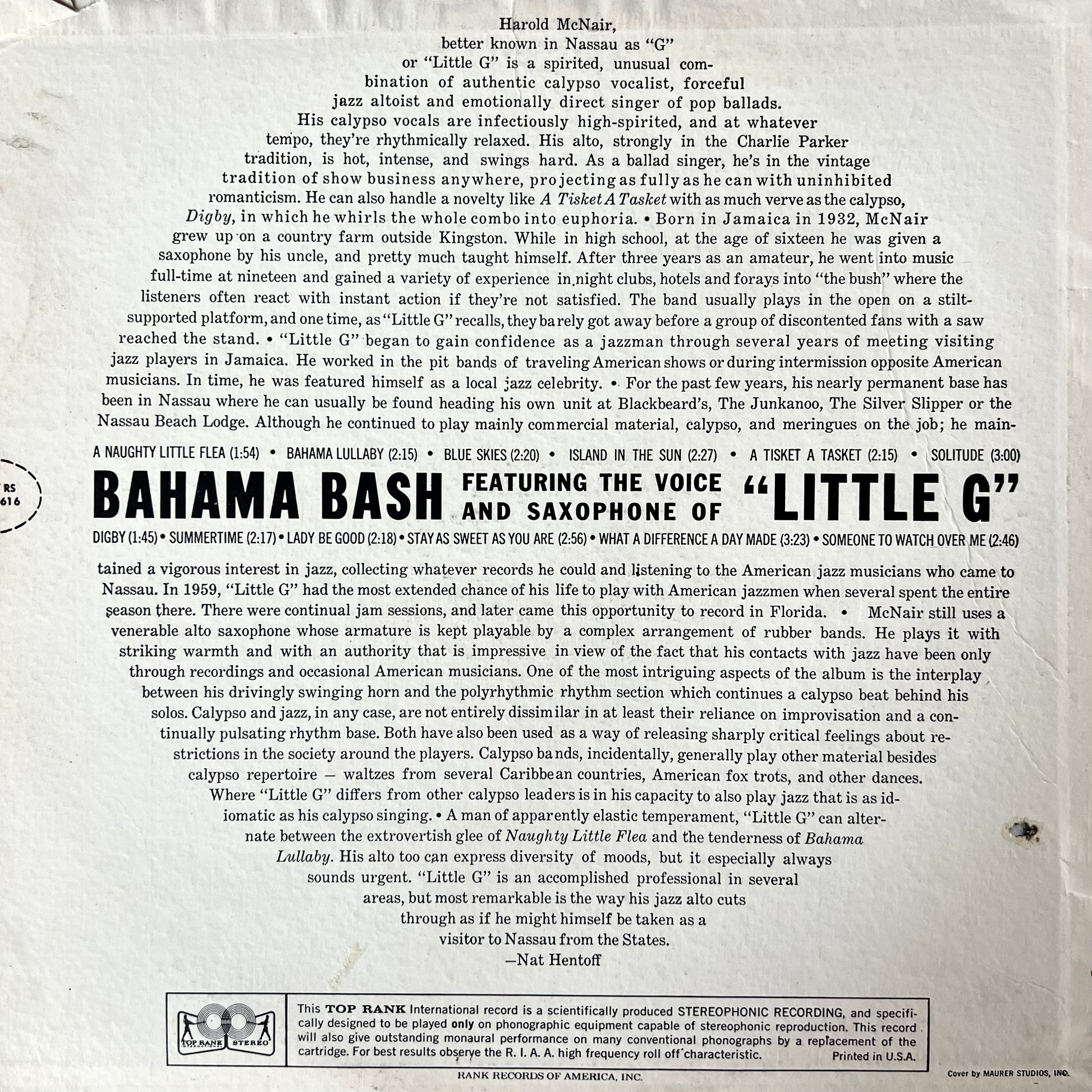 HAROLD MCNAIR born in Kingston, Jamaica. is a latin jazz, big band hard bop music artist. "Bahama Bash" was the first album released under his stagename Little G. After playing calypso music as Little G in the relative obscurity of his homeland and then the Bahamas, saxophonist McNair went to America and then Europe in the late 50. He began playing with jazz musicians such as Kenny Clarke and Quincy Jones and also led his own small group, switching regularly between saxophone and the newly learned flute. It was on the latter instrument that McNair would become better known, with his unique phrasing earning him a series of non-jazz sessions with artists including Donovan, John Martyn, and CCS. For a while he commuted between Europe and the USA, eventually making London his base in the mid-60s. From then until his untimely death from lung cancer in 1971, McNair worked with British and American mainstream and modern musicians, and was also active in the studios. In later decades, his music was frequently ‘raided’ by samplers.