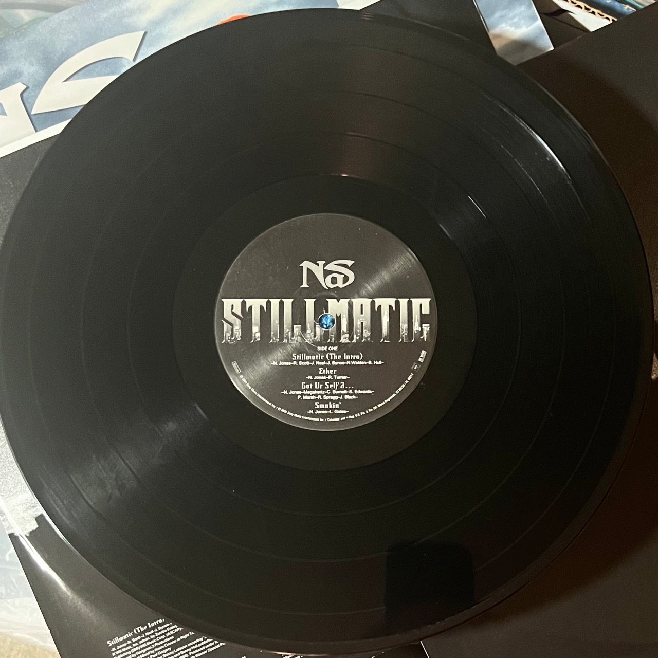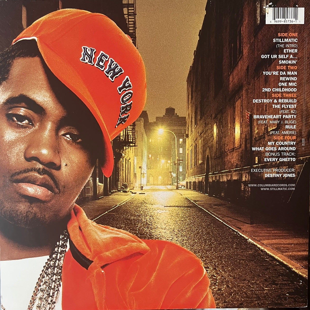 USED vinyl 2001 pressing / 2xLP / Media is VG to VG+ with a few hairline marks and scratches. / Artwork is G+ due to 4 DJ label stickers on front cover. / Its arguably Nas’ most versatile album. He touches on a lot of topics, and most every song is very thoughtful. Back on the hardcore block and with plenty to prove after two years without a record under his own name, Nas designed Stillmatic as a response: to the rap cognoscenti who thought he'd become a relic, and most of all to Jay-Z, the East Coast kingpin who wounded his pride and largely replaced him as the best rapper in hip-hop. The saga started back in the summer of 2001 with the mixtape "Stillmatic," Nas' answer track to an on-stage dis by Jay-Z. A few months after Jay-Z countered with the devastating "Takeover," Nas dropped the comeback single "Ether" and the full album Stillmatic; tellingly, Jay-Z had already released his response to "Ether" (titled "Super Ugly") before Stillmatic even came out. Dropping many of the mainstream hooks and featured performers in order to focus his rapping, Nas proves he's still a world-class rhymer, but he does sound out of touch in the process of defending his honor. "Ether" relies on a deep-throat vocal repeating the phrase, "F*ck Jay-Z," while "You're da Man" hits the heights of arrogance with a looped vocal sample repeating the title over and over. "Destroy & Rebuild" is a solid defense of his Queensbridge home, and "Got Ur Self A..." is an outstanding track, the best here, complete with chant-along chorus. Despite the many highlights, a few of these tracks (most were produced by either Large Professor or Nas himself) just end up weighing him down: "Smokin'," one of the worst, is an odd G-funk track that would've sounded dated years before its release. Stillmatic certainly isn't as commercial as past Nas output, but it places him squarely behind the times. Facts are facts: he's not the best rapper in the business anymore. - Allmusic