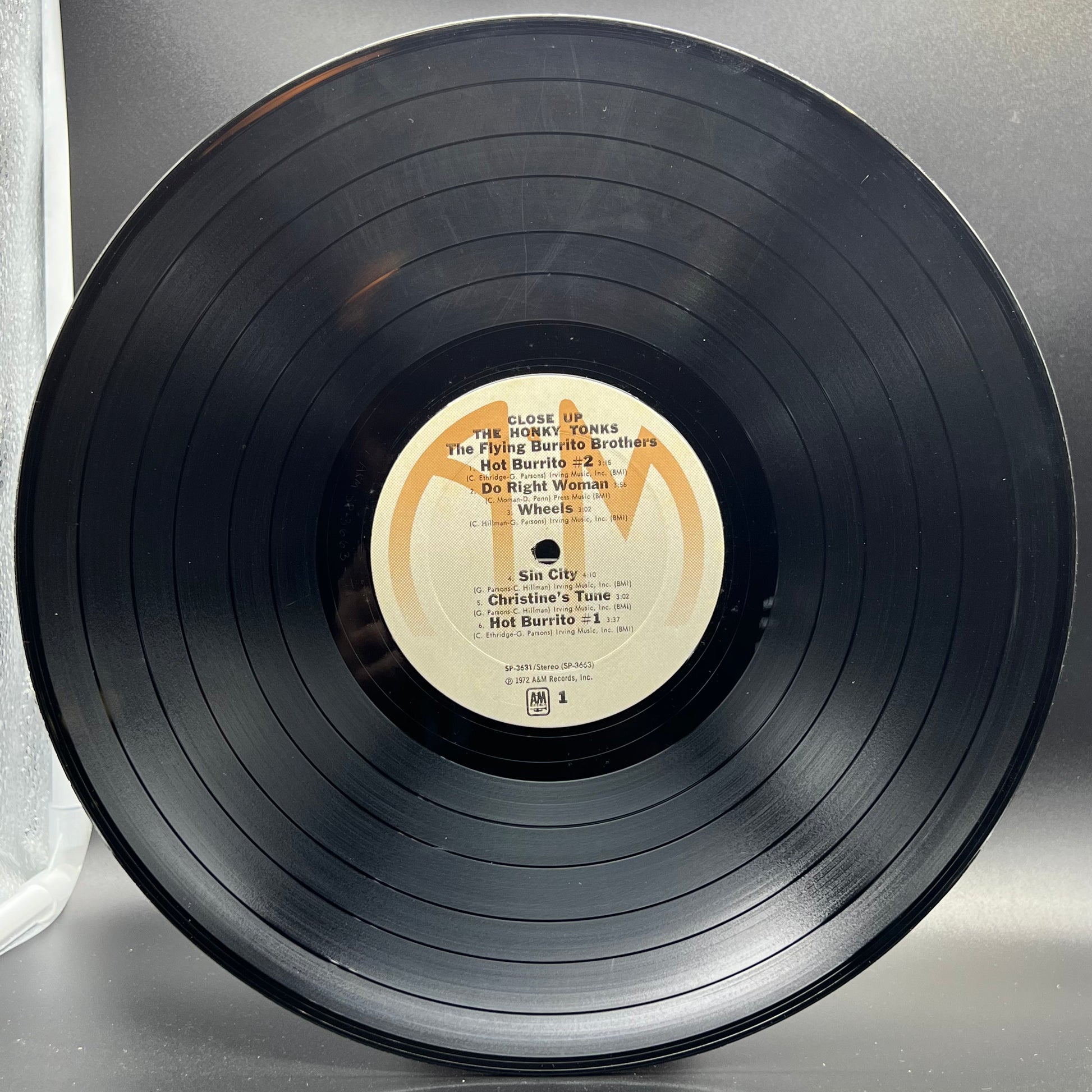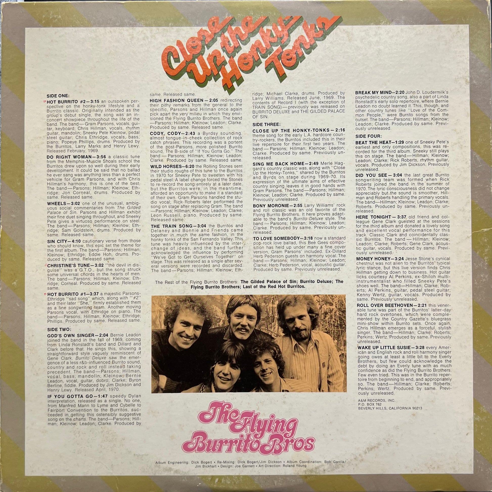 Artwork: Very Good with minor wear and sticker residue on front cover / Media: Very Good (+) with only a few hairline marks / 2xLP / 1974 Terre Haute Pressing / Gatefold / A&M Records seemed to close the book on the Flying Burrito Brothers with Close Up the Honky-Tonks, a 23-track, double-LP compilation. A combination best-of and odds-and-sods career wrap-up, the album contained one LP given over to tracks from the Burritos' first two records, The Gilded Palace of Sin and Burrito Deluxe, plus the non-LP single "The Train Song." The second disc presented 11 previously unreleased tracks, most of them cover songs, ranging from the Bee Gees' "To Love Somebody" to the Everly Brothers' "Wake Up, Little Susie." Co-founder Gram Parsons was featured on the five songs on side three, while side four came from the Rick Roberts era of the band. The Burritos would lack a one-disc best-of until A&M came up with the CD/cassette release Farther Along in 1988. So, for more than a decade, Close Up the Honky-Tonks was the definitive Burritos compilation and contains some excellent performances available nowhere else.