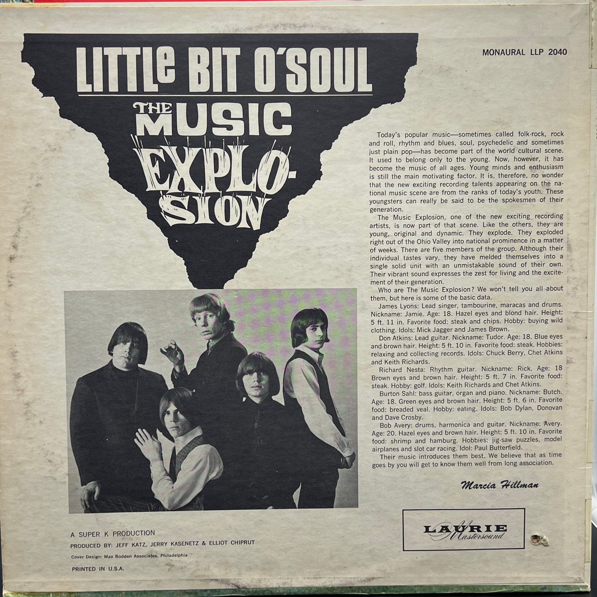 Artwork: Very Good + has small drill hole in bottom left corner / Media: Very Good + / 1967 Rockaway Pressing / Stereo / Some rather cool tracks, in the manner of the trippy fuzz guitar-organ psychedelic songs heard on soundtracks to films exploiting the hippie movement. More importantly, perhaps, the package also includes respectful detailed liner notes, with quotes from several bandmembers. All that borne in mind, you still can't get around the fact that the group didn't have anything too great to offer other than "Little Bit o' Soul." They did virtually no original material, and their songs were average, OK-to-unexciting pop garage rock with a bit of soul and bubblegum, though Jamie Lyons was an above-average singer for bands of this type, with a grittier and more soul-influenced style than the norm.